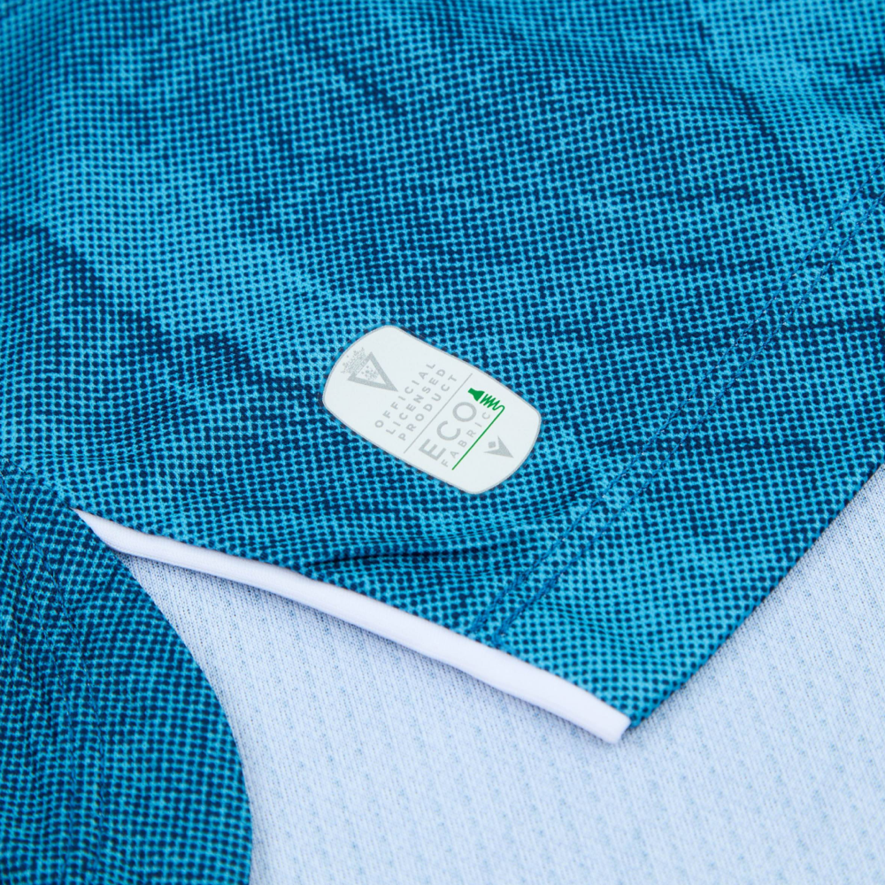 The materials used are 100% polyester, which wicks away sweat and moisture.