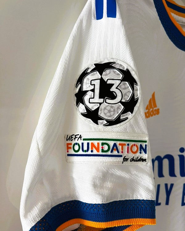 The Real Madrid shirt with the 9 of KARIM BENZEMA emerges on the stage for the 2021-22 season. This masterpiece embellished with Champions League patches is a hymn to the greatness of the Madrid club, once again a winner in Europe and on the national stage led by the phenomenal French player