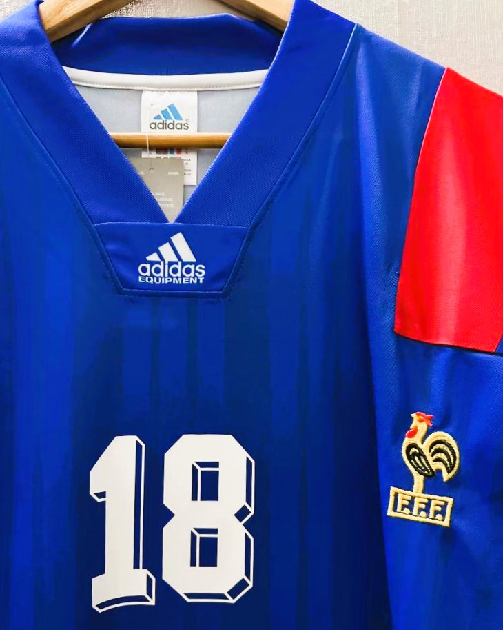 Welcome to the 1992-93 season France jersey page with ERIC CANTONA's number 18, a splendid uniform highlighting the colors of the French flag and King Eric's personalisation, testimony to his controversial relationship with the French national team