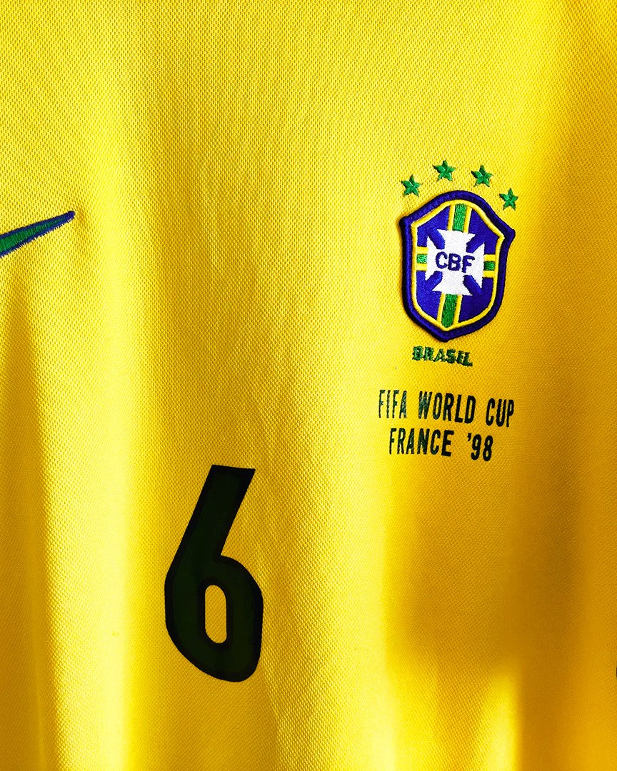 Brazil's jersey with the number 6 of ROBERTO CARLOS is a work of football art from the 1998-99 season. Used at the World Cup in France 98 as evidenced by the commemorative inscription on the chest, it highlights the greatness of the gold-green and the phenomenal Brazilian full-back, an absolute legend of world football