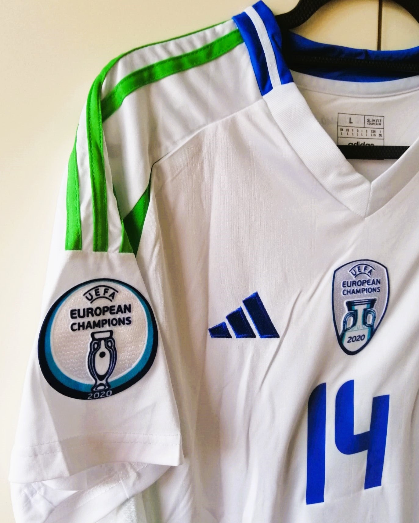 Wear the tricolor with FEDERICO CHIESA's Italy shirt number 14 from the 2024-25 season. Masterfully crafted, it is enriched by celebratory patches on the chest and sleeves that recall the Azzurri's triumph at Euro 2020