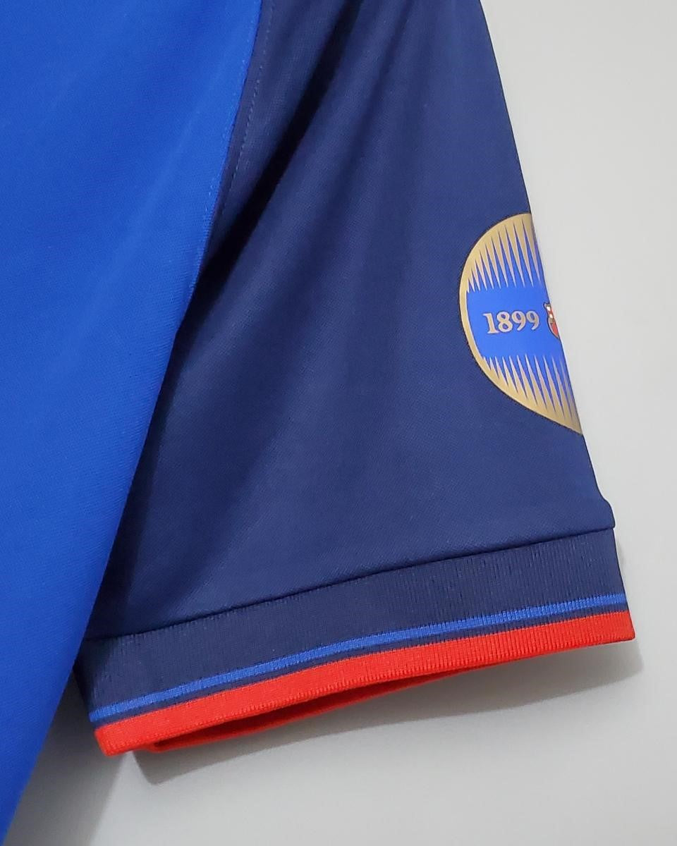 An historic jersey, the one made by Nike for Barcelona's 1999-00 season. On the chest the logo of the Catalan club embraces the centenary dates, on the sleeve the patch bears witness to the century of life of the blaugrana and LUIS FIGO's number 7 elevates the prestige and charm of one of the most beautiful uniforms in Barca's history to the highest level