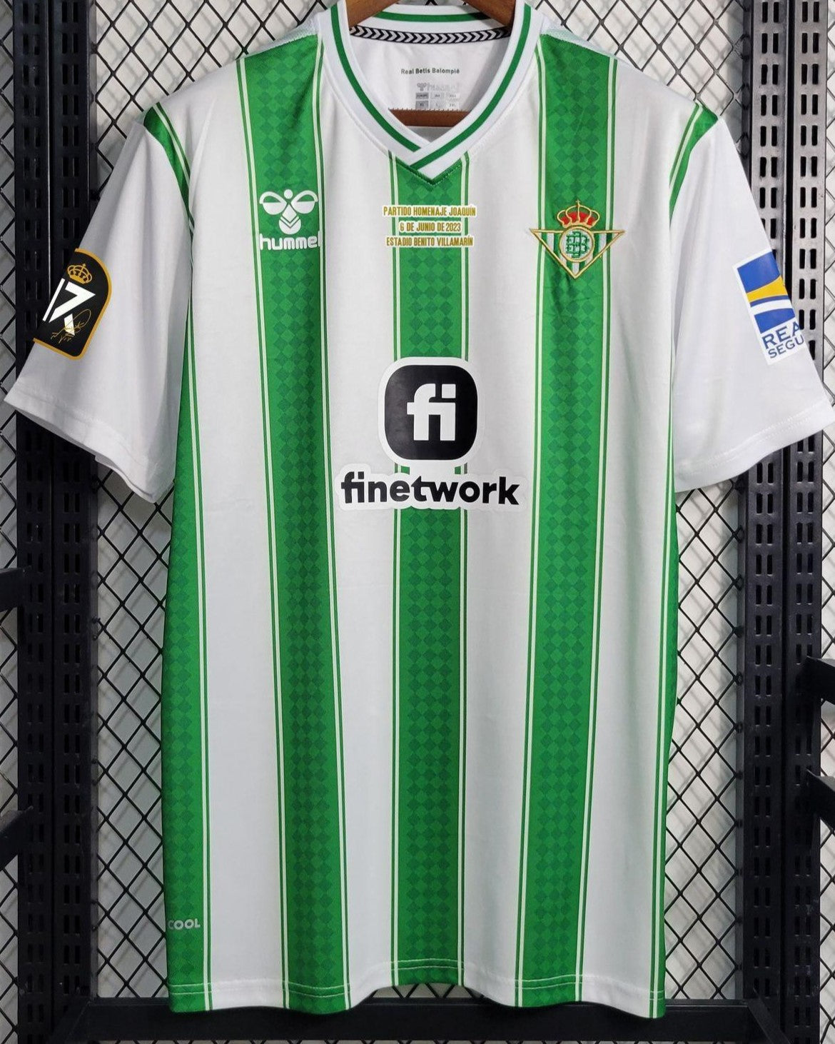 A historic shirt, this one from Betis Sevilla 2023-24, iconic and celebratory of JOAQUIN's career. A jewel created by Hummel that pays homage to the Spanish champion, a career spent in the green-and-white team with his inseparable number 17 and multiple references (such as the patch and the commemorative inscription) that make this an absolutely unmissable masterpiece