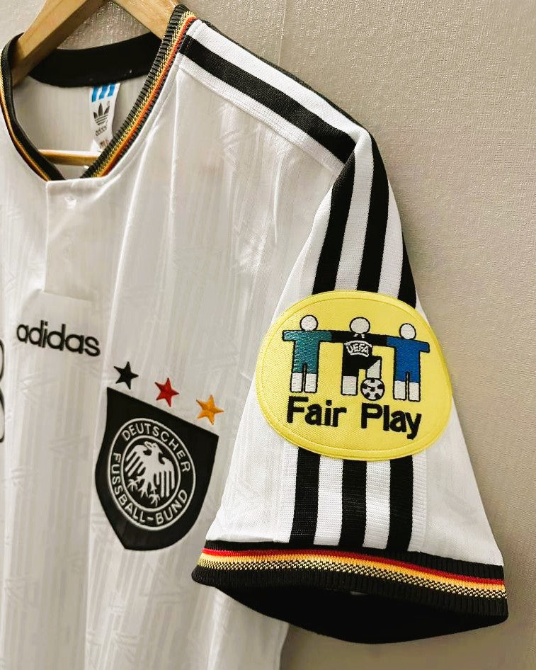 Relive the epic of great football with the 1996-97 season Germany shirt number 18 by JURGEN KLINSMANN. This masterpiece enriched with Euro '96 patches tests to the strength of the German team as European champions with the trophy raised by the phenomenal bomber and captain