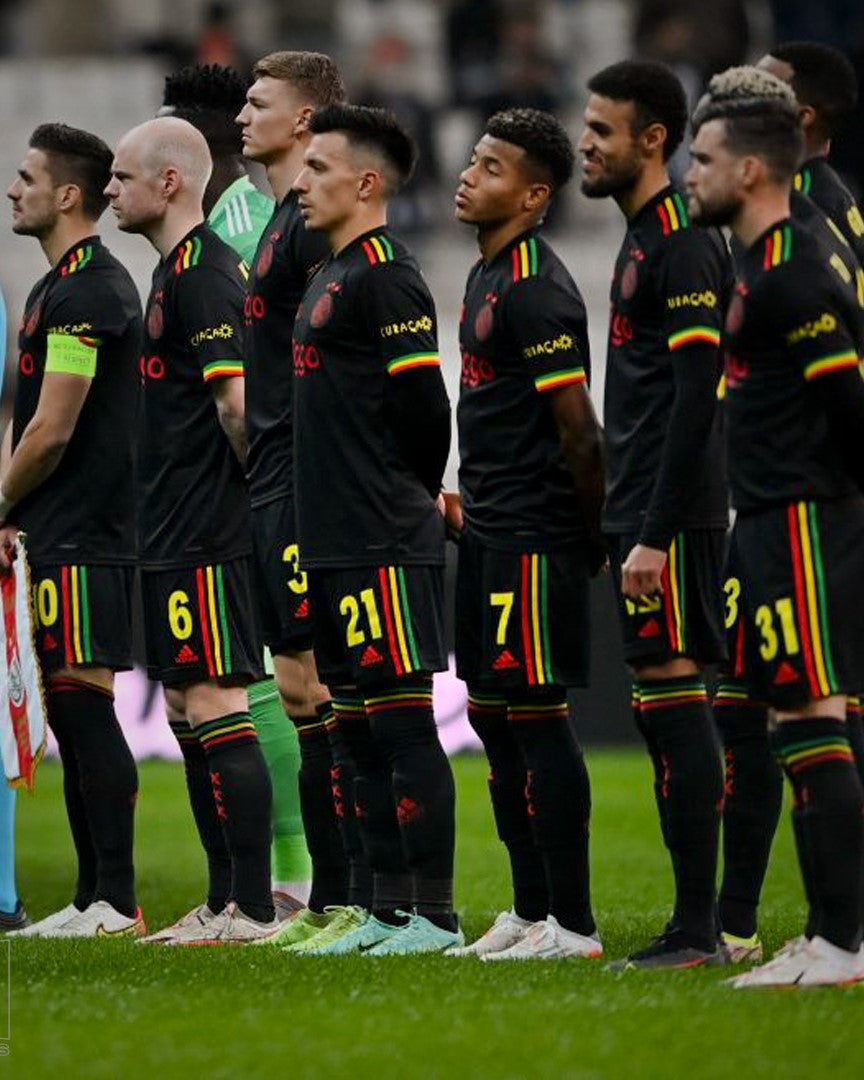 One of the most beautiful jerseys ever, the Ajax 2021-22 jersey dedicated to the great BOB MARLEY. The black embraced by the colors of the Jamaican flag, the red inserts and the 'three little birds' reproduced behind the collar represent an absolute masterpiece of fashion-design for one of the most popular jerseys