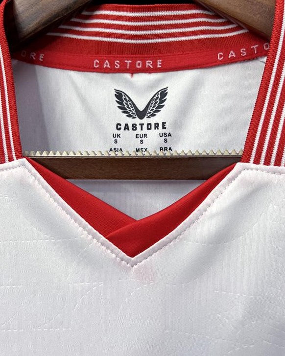 The Sevilla shirt for the 2023-24 season, worn with number 4 by SERGIO RAMOS, is a candid masterpiece created by Castore. Completely white enriched with red inserts and the La Liga patch, it represents a new chapter in the extraordinary career of the phenomenal player who has returned to the jersey of his footballing beginnings