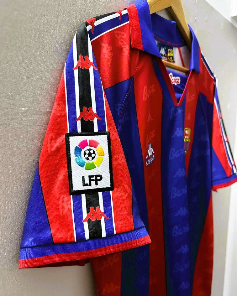Welcome to football history with the Barcelona 1996-97 jersey, an authentic piece of sporting glory with RONALDO's number 9. This blaugrana jewel, enriched with the La Liga patch, is further enhanced by the personalization of the young phenomenon and future world football star