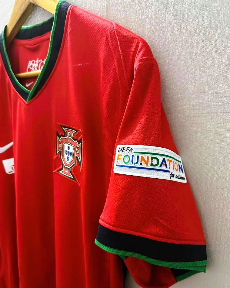 CRISTIANO RONALDO's number 7 Portugal jersey best represents the history and strength of the Portuguese national team. Enriched on both sleeves by the Euro '24 patches, it has the personalization of the Lusitanian star adding further prestige to an extraordinary uniform